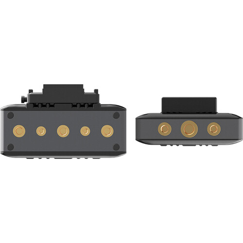 The receiver features 4 x SDI/HDMI outputs (one for each transmitter) for connecting to a monitor or switcher. You can also connect the receiver to a LAN, allowing you to pass control signals from a control panel to the transmitters. This enables you to control PTZ cameras as well as send tally information. The transmitters have a dedicated tally output port. Both units also have an OLED display that confirms the resolution, transmission channel, signal strength, and other details such as battery power. The transmitters each have a built-in L-series battery plate, and the receiver has a V-mount battery plate. Both Transmitter and receiver feature a 2-pin power input for extended run times.