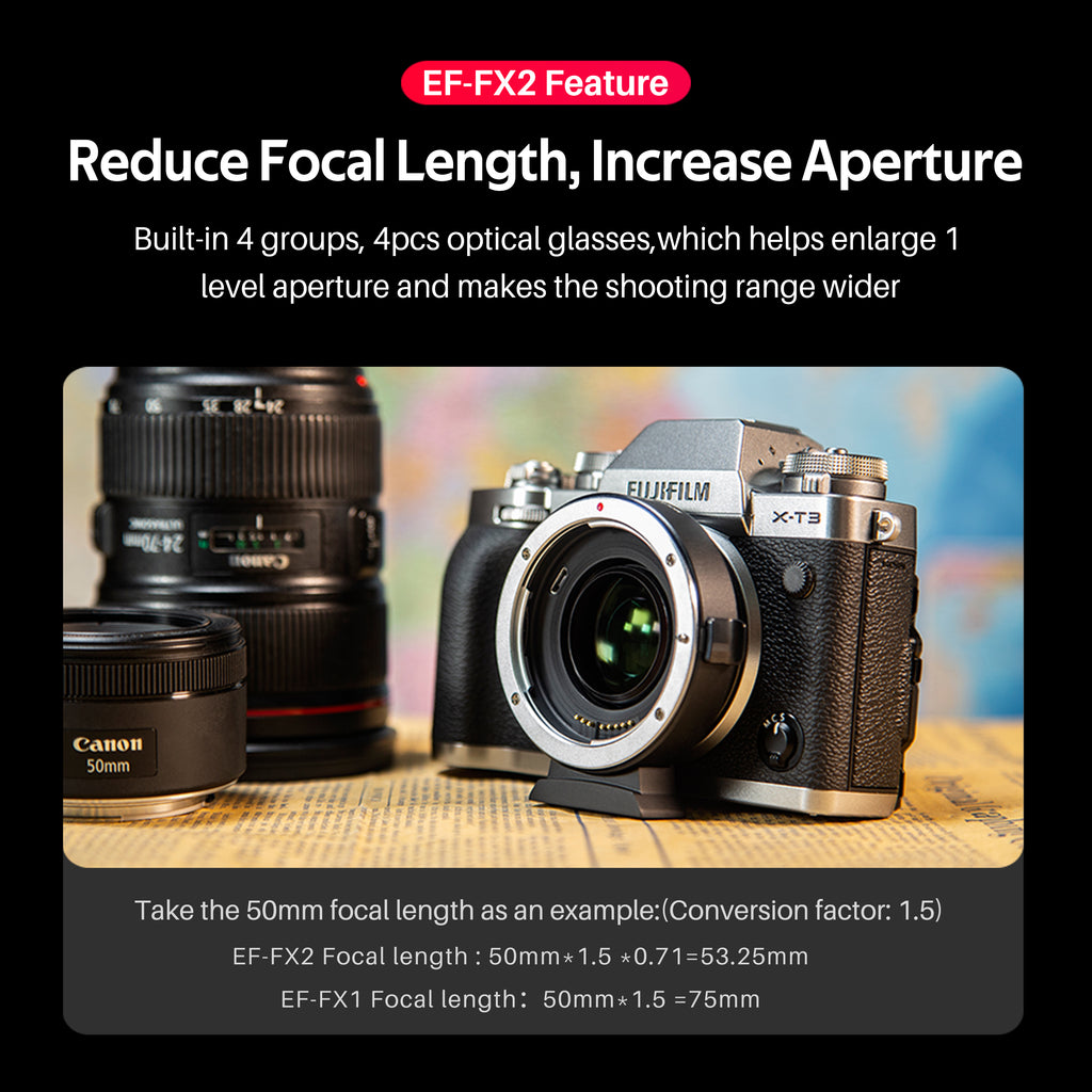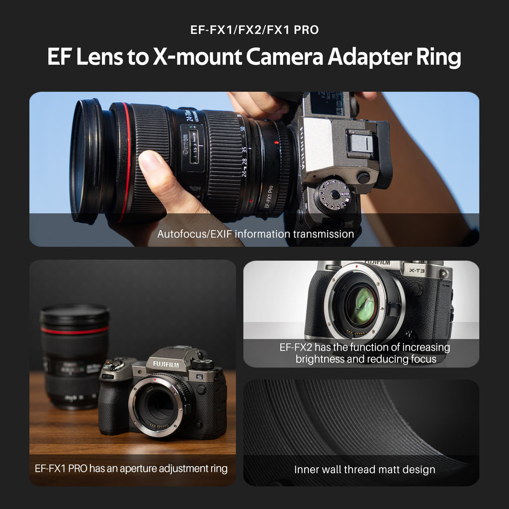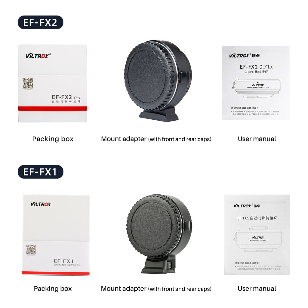 Bộ chuyển đổi ngàm dòng Viltrox EF-FX được thiết kế để ống kính dòng Canon EF/EF-S được gắn hoàn hảo trên máy ảnh không gương lật ngàm Fuji X. Nó được làm bằng kim loại với xử lý mạ bề mặt, bền và chắc chắn. Được tích hợp các điểm tiếp xúc điện tử, nó hỗ trợ lấy nét tự động, điều chỉnh khẩu độ và truyền tín hiệu EXIF.