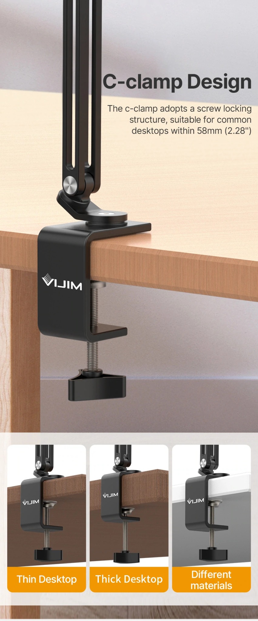 ◾ Phần kẹp chữ C sử dụng cấu trúc khóa vít, phù hợp với các bề mặt bàn bàn thông thường trong phạm vi 58mm (2,28''), chẳng hạn như: bàn làm việc, mặt bàn bếp, đầu giường, v.v.